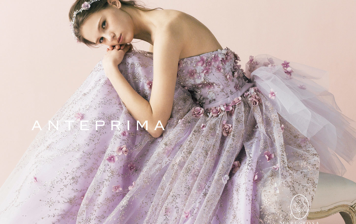 “ANTEPRIMA”の代名詞とも言える光のテクニックは繊細なビージングレースや軽やかに輝くグリッターとなってドレスに上品な華やかさを添えています。
