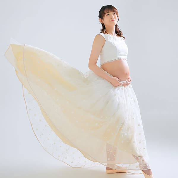 『ラグニティ』とは…「ラグジュアリー」+「マタニティ」の造語で、ドレスをアレンジした高級で上質なマタニティ衣装のことです。