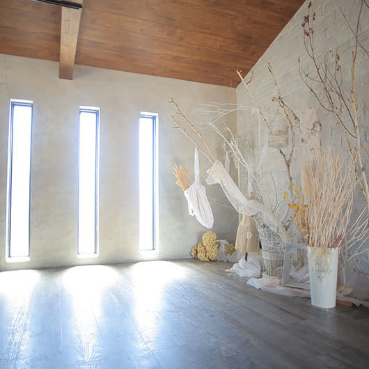 建物の前にはガーデン挙式やお祭りイベントができる広場、1階にはライブラリーカフェのような広々としたロビー、2階にはドレスショップ『ル・シフォン』と少人数挙式ができるチャペルがあります。
